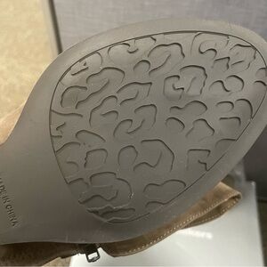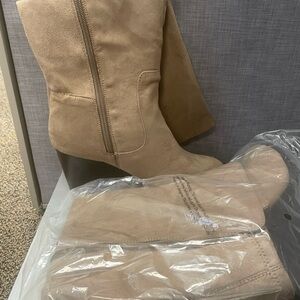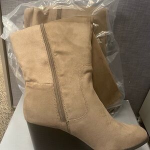 Cloudwalkers presents these tan heeled boots, crafted with a sleek and minimalist design in a suede-like material. The mid-calf height and medium wedge heel offer both style and comfort, while the side zipper ensures easy wear. Perfect for versatile styling, these boots are a chic addition to any wardrobe.