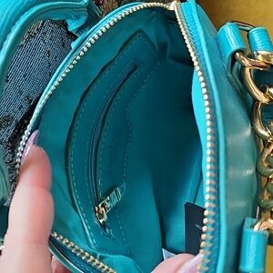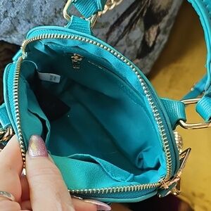 This Bebe mini bag in a striking teal hue is a standout accessory with its shiny gold hardware and structured design. Perfect for adding a pop of color to any outfit, it features a convenient shoulder strap for easy carrying. Ideal for those who appreciate both style and functionality in a compact form.