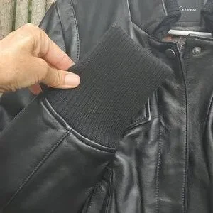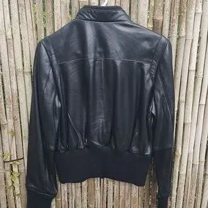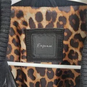 Leather cropped , leopard print lining. ribbed knit cuffs and waist in very good used condition. no size tag but fits like a small.