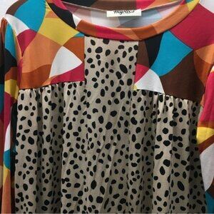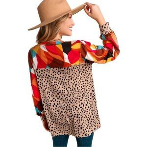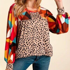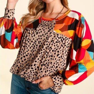 Artsy Geometric Animal Print Top Women Size large Long Sleeve Colorful Boho