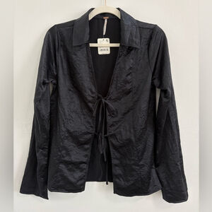 Effortlessly chic and brand new with tags, the Free People Star Eyes Top is a sleek addition to any wardrobe. This black, collared cardigan-style top offers a refined satin sheen, side slits on the long sleeves, and an open front with two adjustable ties for customizable closure.