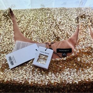Stunning gold sequin maxi dress by NADINE MERABI. Perfect for glamorous occasions. Eye-catching and elegant design.