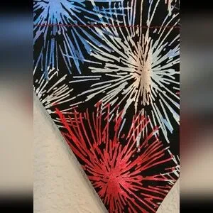 Vibrant bandana with a shimmer-metallic fireworks pattern. Features red, blue, and white bursts on a black background.