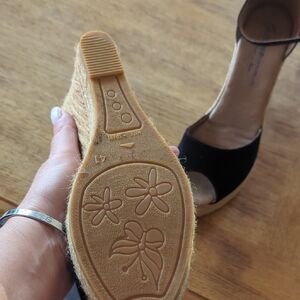 These stylish wedges feature a black canvas upper and a natural jute wedge heel, offering a perfect blend of comfort and height. The ankle straps with buckle closures ensure a secure fit, making them ideal for casual summer outings.
