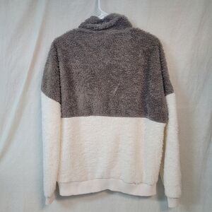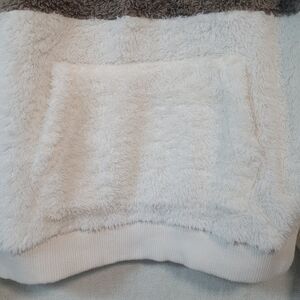 Stay warm with this cozy two-tone fleece pullover. Features a soft brown and cream/ivory design with a convenient front pocket.