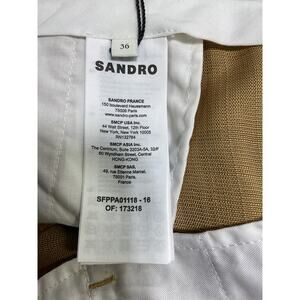 Sandro Tailored Tapered Beige Viscose Trousers Size 36: belt loops side-seam pockets back welt pockets zip-fly with hook-and-eye closure.