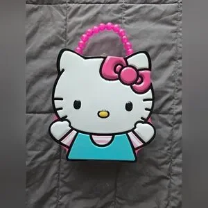 Cute Hello Kitty handbag with pink and blue accents. Features a pink beaded handle.