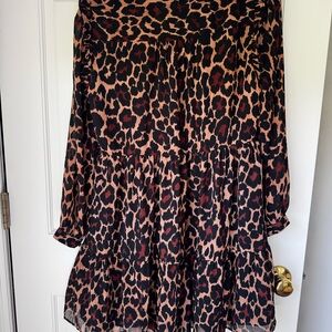 Stylish leopard print mini dress. Features long sleeves and tiered design. Perfect for a chic look.