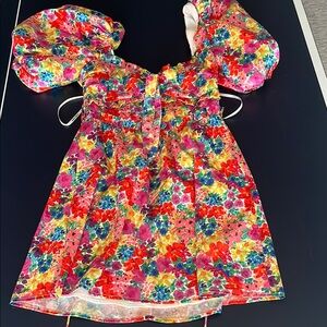 Vibrant floral dress with puff sleeves. Perfect for a bold look.