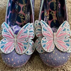 Step into a world of enchantment with these Irregular Choice heels, showcasing a vibrant blend of purple and pink hues. These shoes are crafted with a unique and whimsical design, perfect for making a bold fashion statement. Elevate your style with their playful charm and distinctive flair. Worn 1-2 times, some wear on bottom but excellent shape. Comes with box. There are heel pads in the photos, but they have been removed ☺️