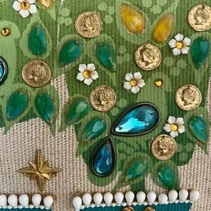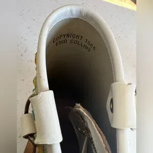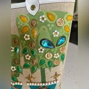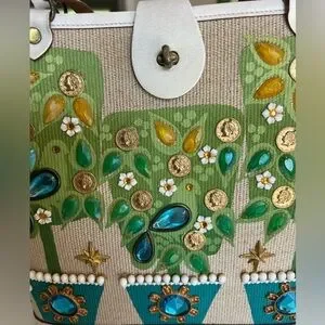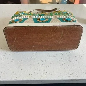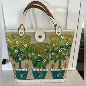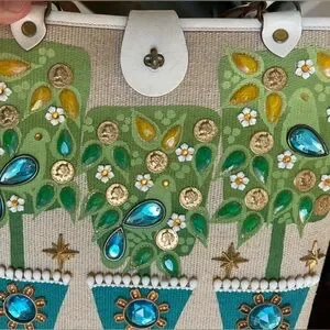 Enid Collins purse “it grows on trees 2”. From 1966. Great condition for its age. Zipper inside still functions. Clean on the inside. Missing a bird’s eye jewel and one of the beads that lines a flower pot has come unglued but is still attached. Approximately 13” wide , 10 1/2” tall and 4” deep
