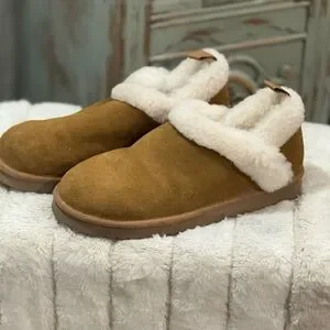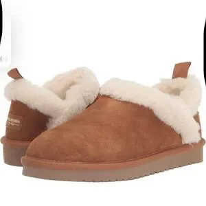 Step into comfort with Koolaburra's tan slippers, featuring a plush white lining for warmth and a durable rubber sole for indoor wear. These slip-on slippers offer a cozy fit with their soft suede-like exterior, making them the perfect choice for lounging at home. Barely worn, note that some pics are stock from Amazon but the last pic is my shoes. No flaws