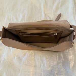 Cuyana suede pink saddle bag crossbody in a light dusty pink. Lighter pink in person. Some markings/discoloration.