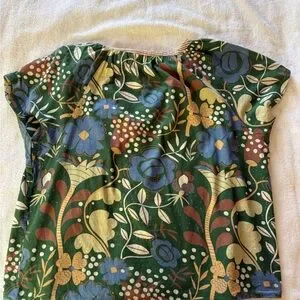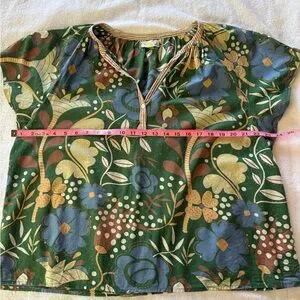 Stylish blouse with a vibrant floral pattern. Features green, blue, and brown colors. Excellent condition.