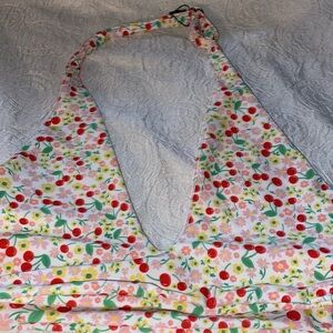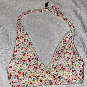 New Size Small Skatie Bikini Top, adjustable straps, halter style, stretch 21% Spandex, Bright red cherries and yellow flowers stand out.