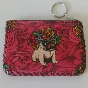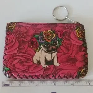 PUG w/ Flowers Printed COIN PURSE / WALLET Zipper Vegan Leather