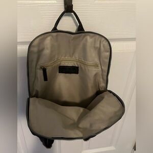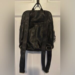 Stylish black embossed leather backpack with gold accents. Perfect for everyday use.