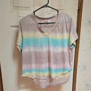 This top features a relaxed fit with a V-neckline and short sleeves, perfect for casual wear. The multicolored design adds a vibrant touch, while the lightweight fabric ensures comfort. Its cropped style offers a modern and trendy look. Size xlarge.