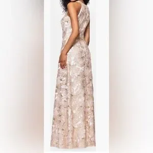 “A glittering garden tells a gorgeous style story for a sleeveless gown that's sure to turn heads and inspire toasts.”