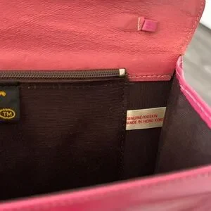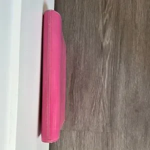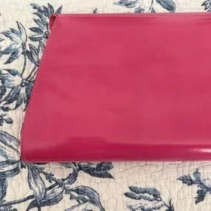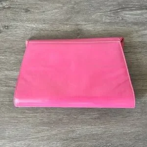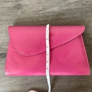 A fun mod goatskin pink clutch. Really great statement piece. Not sure how vintage it is, guessing 80s? Purchased at an estate sale with some designer items. There are surface impressions and scuffs but the condition is great. One interior zipper pocket. Some markings in the interior as well as a blue mark on the inside top flap. Magnetic closure. Has loops for a strap but sadly the strap is not with us anymore. Pretty!