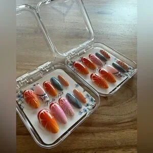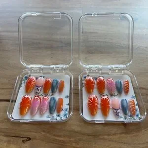 Brand new vibrant press-on nails sets in orange, pink, and blue. Perfect for vacation.