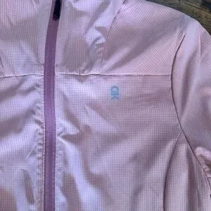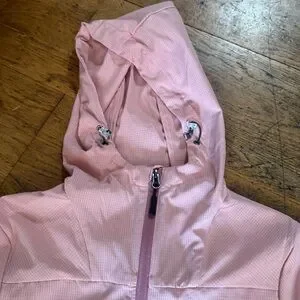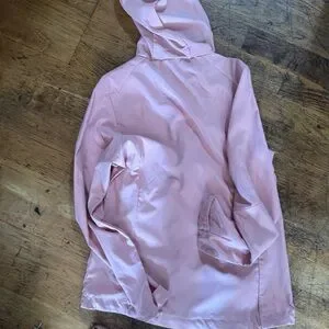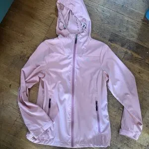 Lightweight utility jacket. Hooded design. Front zipper closure. Two zippered pockets.