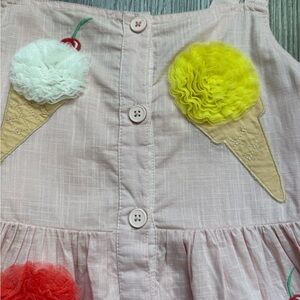 NWT Mini Boden button front logo dress in pink ice creams. Beautiful dress with special tulle ice creams. Buttons all the way down the front. Has an underskirt layer. Straps can be adjusted for sizing and to wear for more than one year. Can also wear straps crossed in the back or straight up and down. Super special dress that’s a sold out style.
