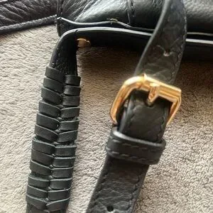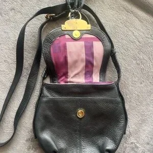 Fun medium size black leather crossbody bag with gold accents.