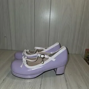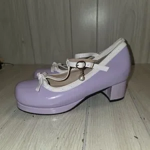 Jingpin Womens Lavender Pin Up Girl Mary Jane Shoes Block Heel Bow Pearl Charm