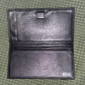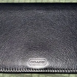 Experience the elegance of Coach with this black leather checkbook holder, designed for both style and practicality. Made from high-quality leather, it boasts a smooth, durable finish that complements any accessory collection. Like-new condition.