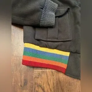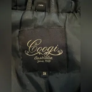 Coogi Australia Spell Out Rainbow Hooded Gray Jacket Coat Womens. Missing faux fur for hood and missing zipper. See pictures for a couple spots. Dry clean only. Rad vintage Coogi vibes.