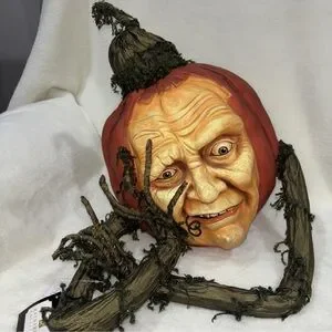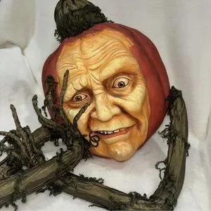 People turned to pumpkins by a witch? Or cursed pumpkins come to life?? You decide!.This midnight pumpkins features eerily life-like faces carved into them, just look at the wrinkles and expressions!This is the short one featuring a freaked out, concerned face like he just crossed a witch..It has wiry arms covered in vines and foliage. Perfect for welcoming (or warning) guests!Made by Katherine's Collection. Made of paper mache and resin. Dimensions: Short 15" x 15" x 14".PERFECTLY IMPERFECT: Every piece of this collection is handcrafted. As such is the nature of the items, details may vary from piece to piece. But that is what makes them charming and exceptional - no two are alike. This quality makes them truly special indeed.