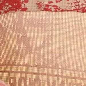 Crafted from raffia straw in beige with red intricate patterns, featuring a Toile de Jouy or similar nature-inspired print.