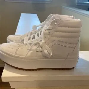 Elevate your look with these Vans platform high-tops. All-white design for a clean, modern style.