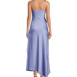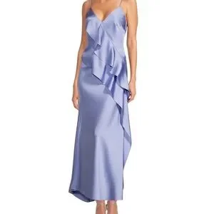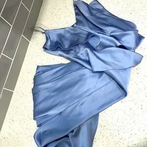 Gianni Bini blue satin dress. features an asymmetrical ruffled design that adds a touch of elegance and movement. With its sleeveless spaghetti straps and v-neckline, it's perfect for occasions like weddings, proms, or cocktail parties. The dress's fluid silhouette and soft fabric ensure a comfortable and stylish fit. Size 8. Worn once to a non-smoking event. In excellent condition. Purchased new in June for $209. One of the most flattering and forgiving dresses I’ve ever worn. I’m typically an 8 in dresses and a 10 in pants size.