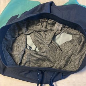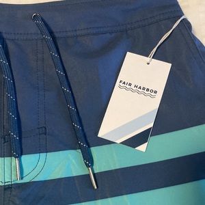 Stylish swim trunks with a drawstring waist. Features blue and green color blocks. Perfect for beach days.