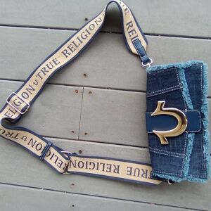 This True Religion crossbody bag showcases a sleek blue design, enhanced by gold hardware for a touch of elegance. Its crescent shape and medium size make it perfect for daily wear, blending casual style with sophisticated details. denim