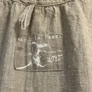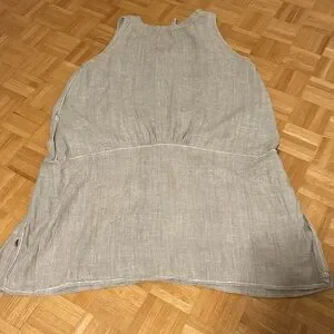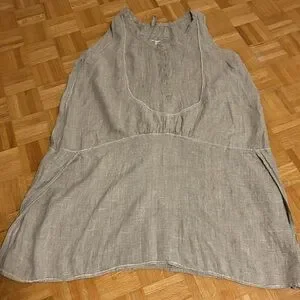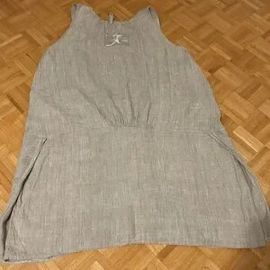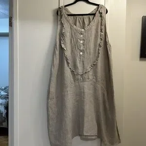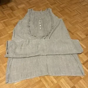 Chic gray sleeveless dress with ruffle details and button front. Heavy thick linen, Please zoom in all photos, Sold ASIS as a used item, Ptp 27”