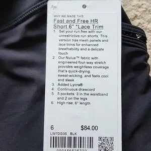 Lululemon Fast and Free High-Rise Short 6" *Lace Trim size 6 in Black. Brand new with tags, no flaws.