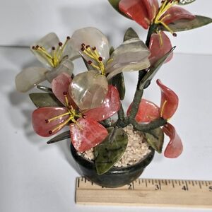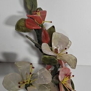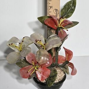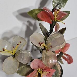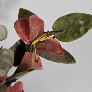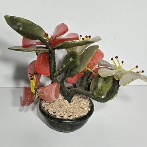 This vintage Chinese Jade Tree Blossom with Marble Base is a unique and handmade collectible that represents Chinese culture. Made in China, this 7" piece features intricate details and craftsmanship that showcase the beauty of traditional Chinese design. The jade tree with blossoms and marble base adds an elegant touch to any collection, making it a sought-after item for collectors interested in Asian artifacts.