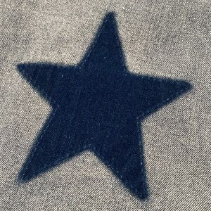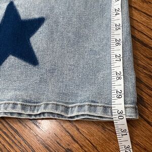 Stylish super wide-leg jeans. Features blue star patches. Perfect for casual wear. Elastic waist on back. Button and zip closure. Pockets.