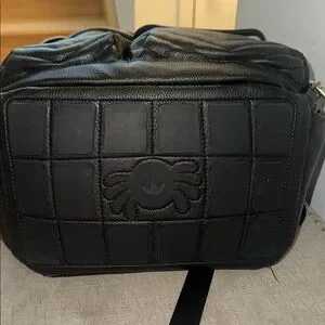 Stylish black faux leather backpack with tassel detail. Features multiple pockets and gold-tone hardware.