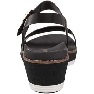 Elegant black leather straps with a white platform. Stylish buckle detail. Perfect for casual outings.