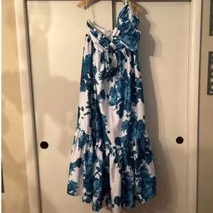 Chic maxi dress with blue floral design on white. Sleeveless and flowing style. Ideal for versatile wear. The dress is gorgeous. Bummed it doesn’t fit anymore. My loss your gain. Make me an offer🫶🏼