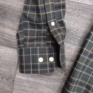Stylish green plaid shirt. Button-down design. Perfect for casual wear.