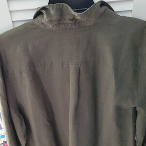 Chico's NWT olive green linen tunic. Features a relaxed fit and no-iron linen fabric. 2 front pockets, ¾ sleeves. Button Front. Cool and Comfortable, Very Soft Linen.