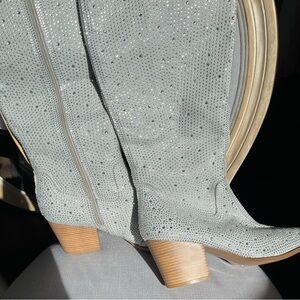 Step out in style with these elegant rhinestone-studded women's boots. Perfect for adding a touch of sparkle to any outfit. The light gray color complements a variety of looks. Size 11, heel 3”