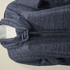 Blue long sleeve pullover sweatshirt dress.. cowlneck with drawstring.. thumb holes in long sleeves.. zipper pockets..
