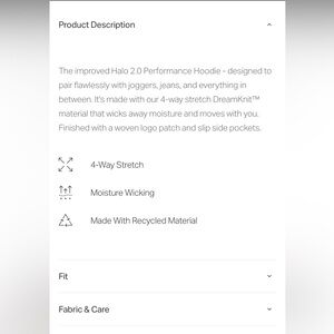 This Halo Performance Hoodie is gently used and is in very good condition. No pilling, holes, or tears. The color is a green/blue, I think it might be called Lake Heather.