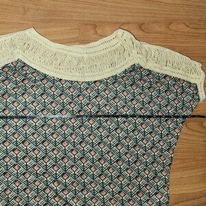 Free people beige woven neckline and sleeves. Pattern looks like diamonds of orangey-beige with navy blue lines and diamonds around them. Sleeves are a little bit longer than average short sleeves.